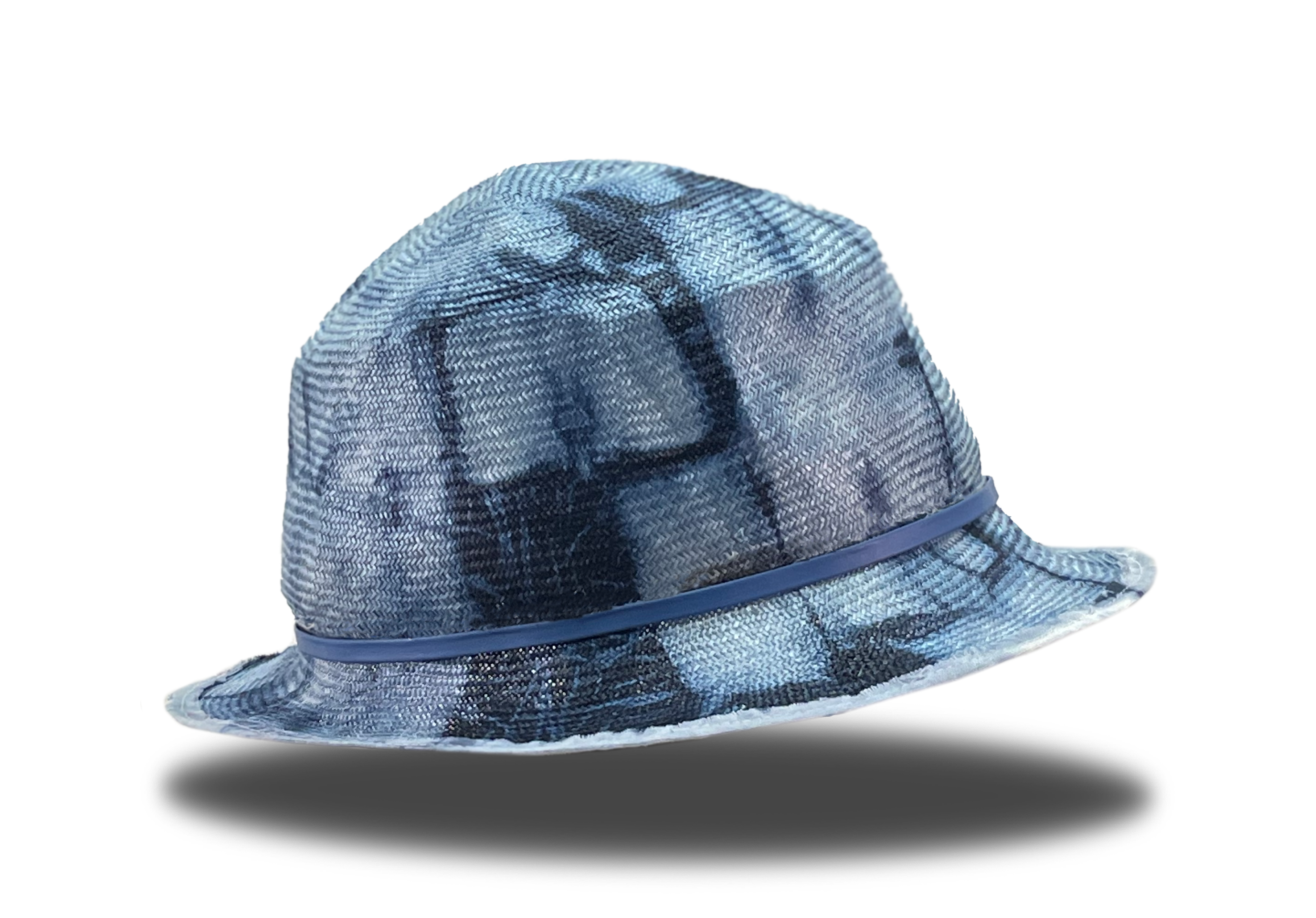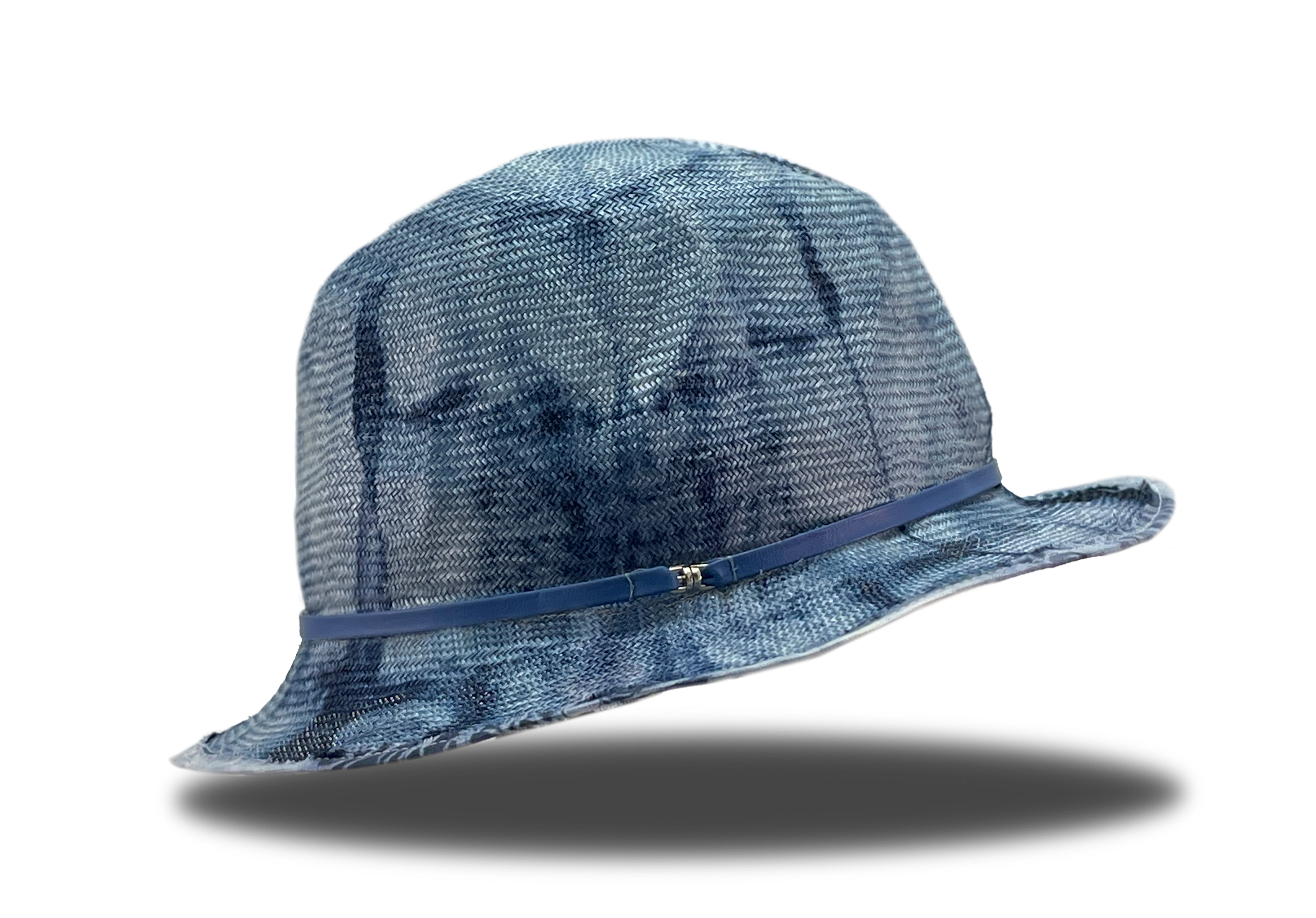 This custom Shibori dyed bucket hat is finished with a thin blue leather band and silver hardware.