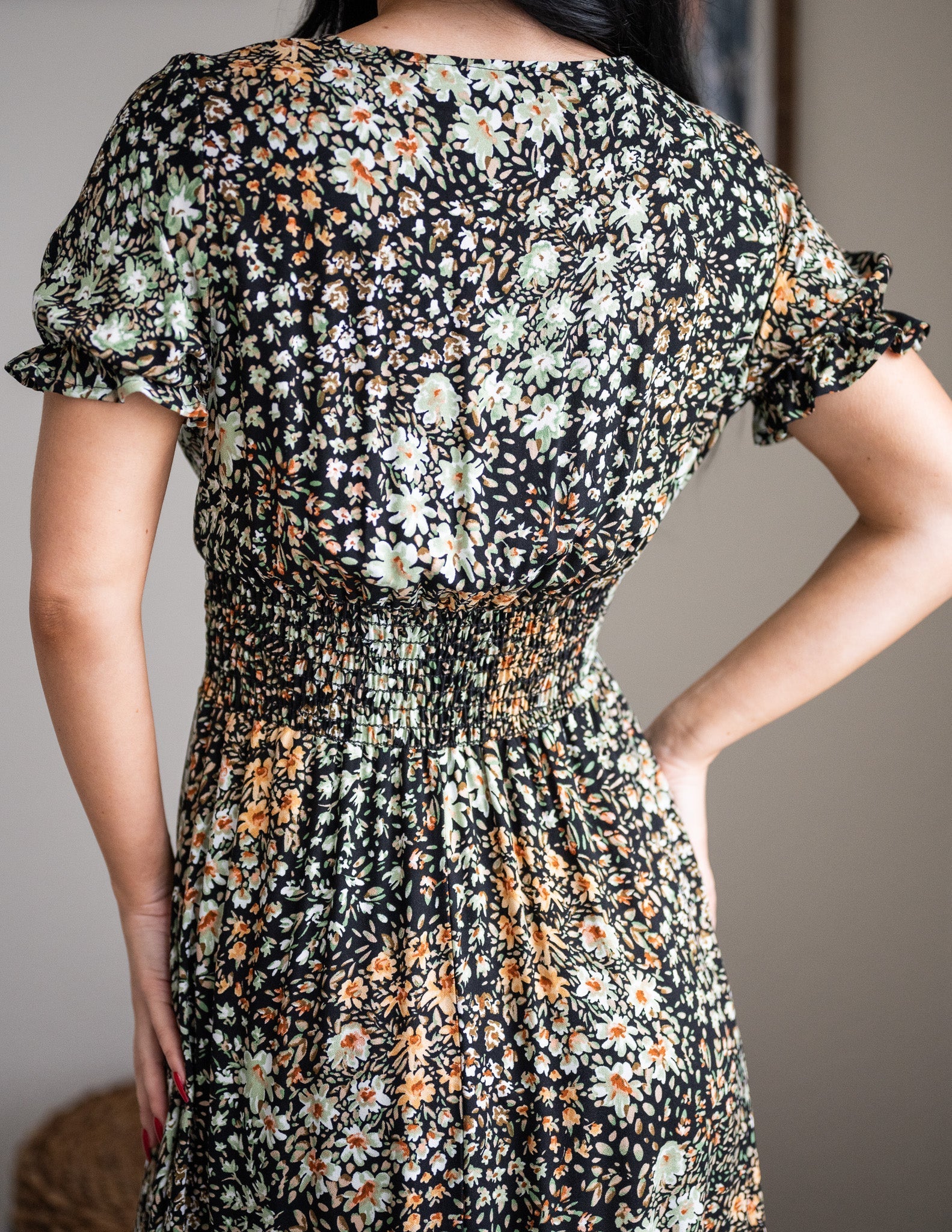 HAZEL MIDI DRESSSoft woven floral midi dress featuring a surplice neckline, puffed elastic short sleeves, a smocked cinched waist, and a rounded hemFABRIC & CAREFabric is lightweight, soft, and non-stretchy100% Rayon Patterned, cut, and sewn by hand in Los Angeles, CAMachine wash with cold water in a wash bag on delicate cycleFlat DrySIZING & FITLength Approx. (from shoulder): XS 43.5", S 44", M 44.5, L 45", XL 45.5 Genevieve is wearing a size Small in Floral BlackHeight: 5'5Bust: 33DWaist: 24.5"Hips: 34"https://livesozy.com/pages/sizing