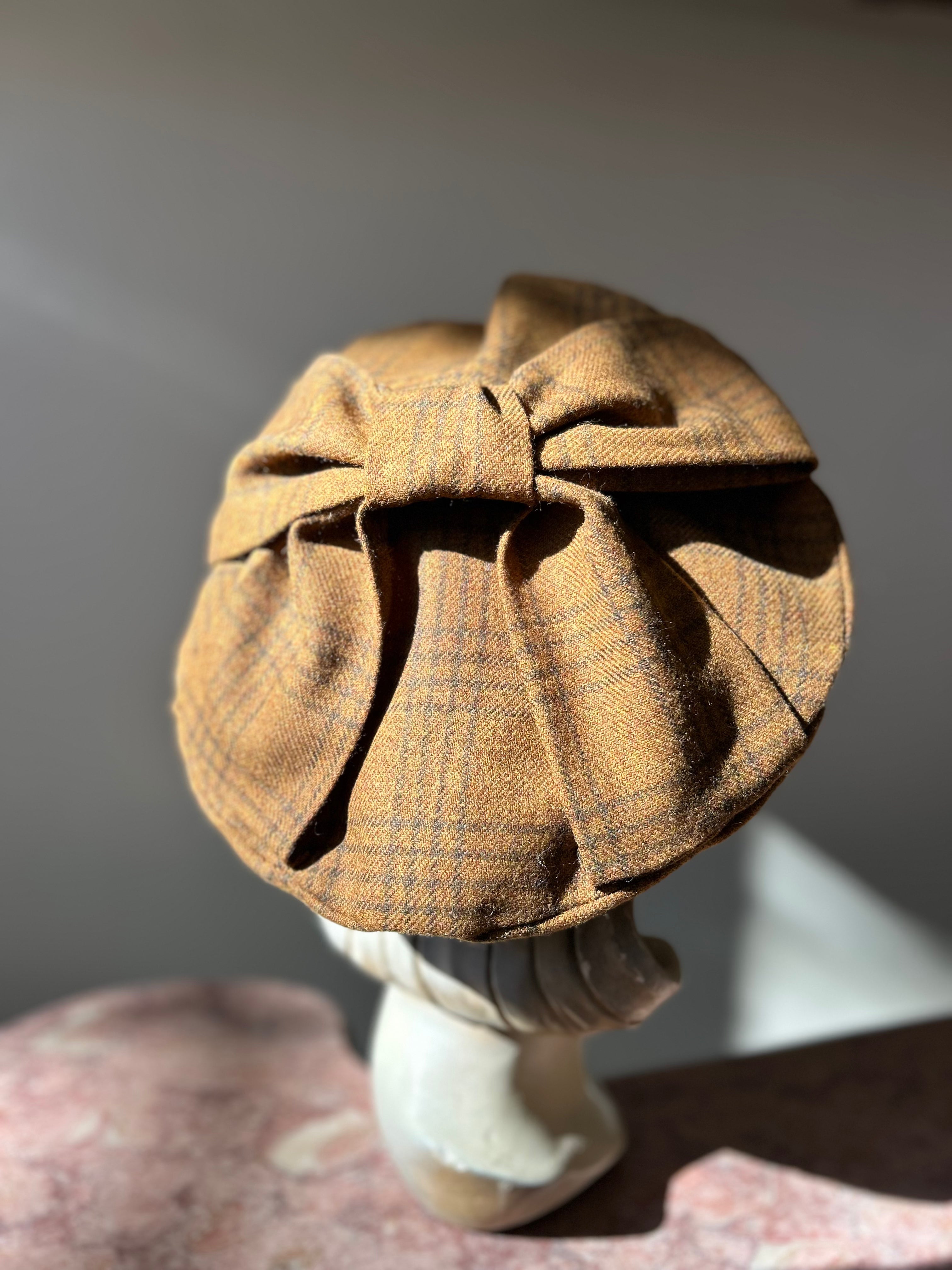 A statement piece that is made with craftsmanship and artistry. A classic plaid beret woven from the finest wool. The pièce de résistance is the large whimsical bow. Finished with a 100% silk lining.