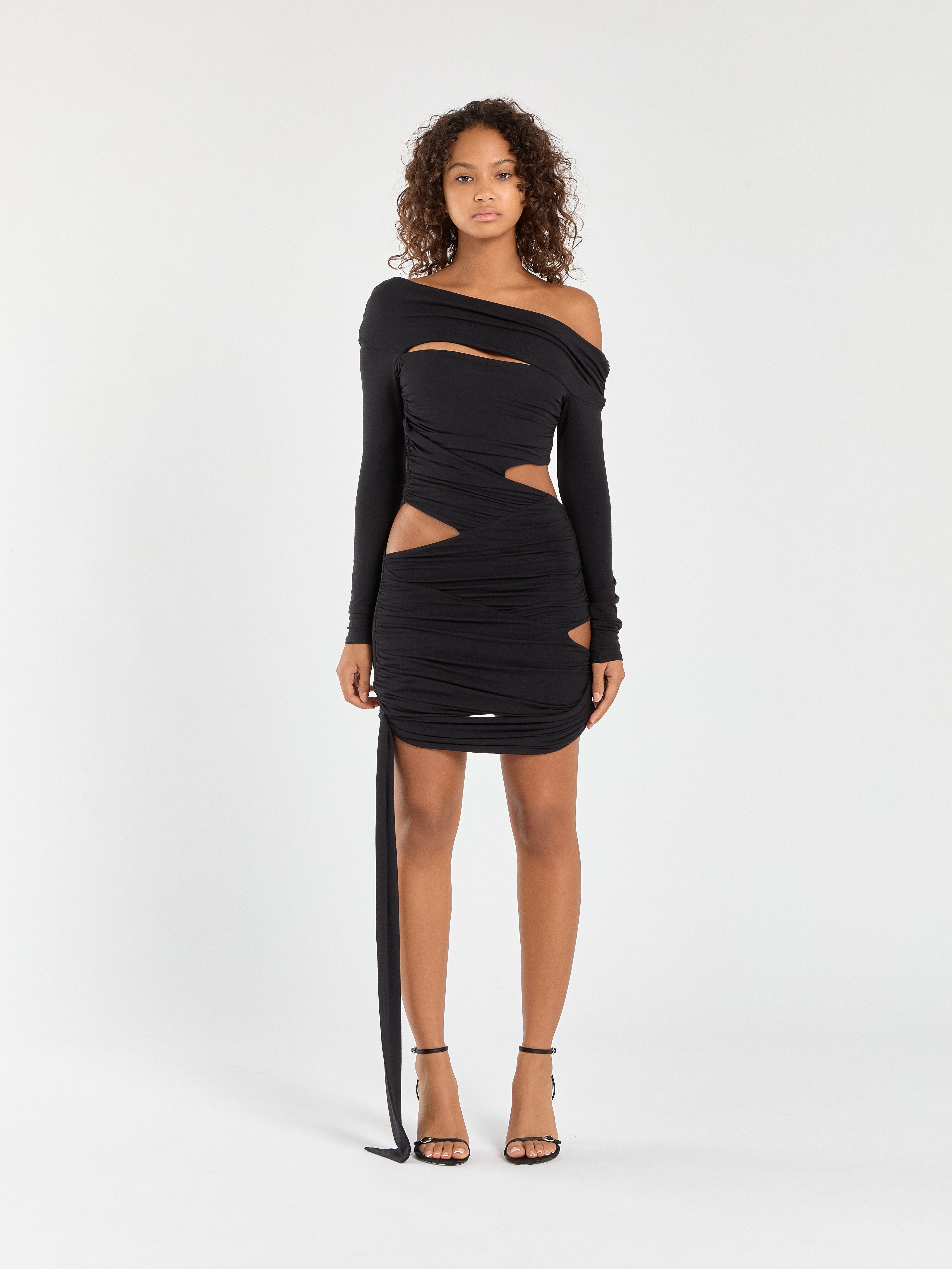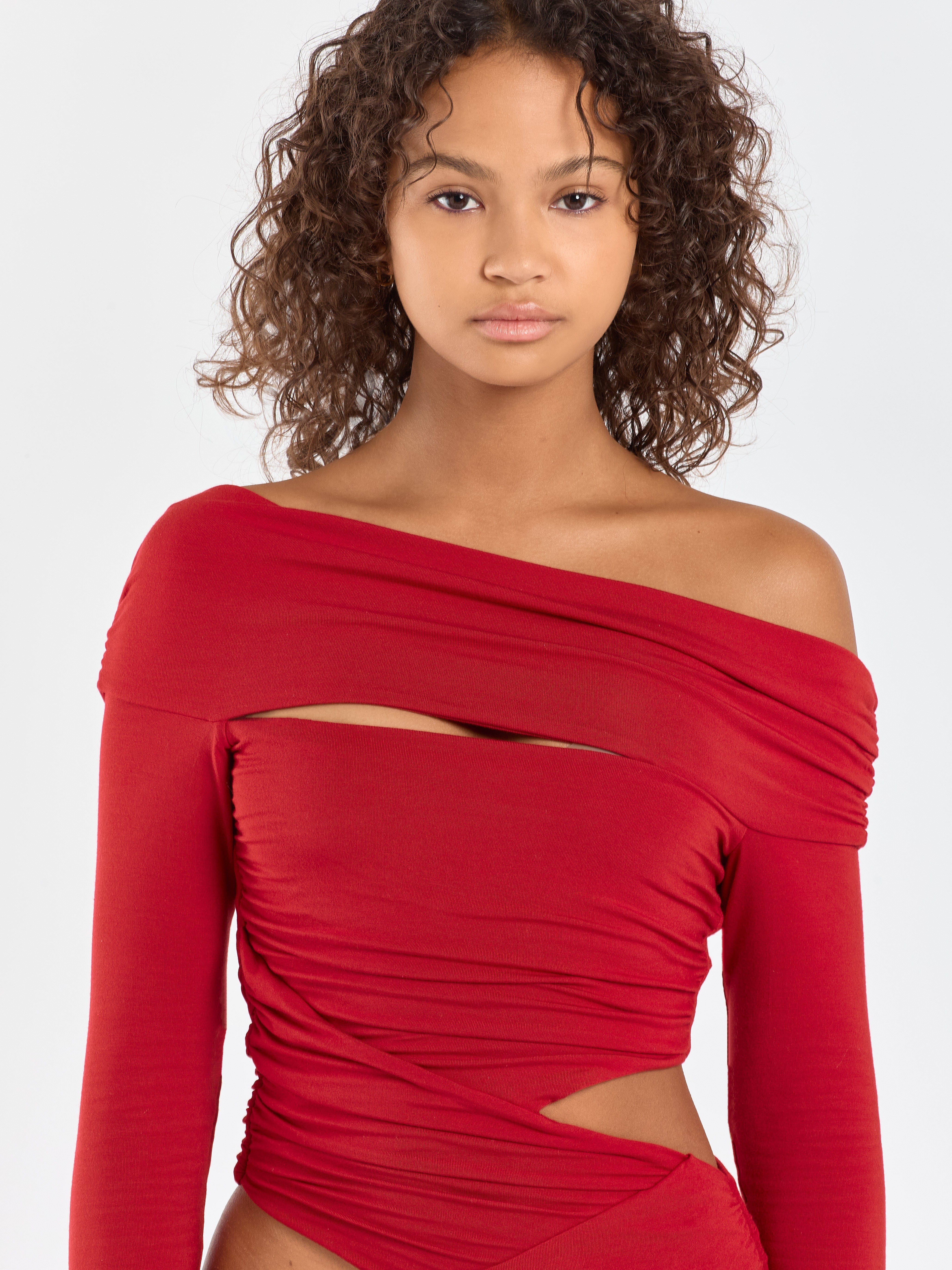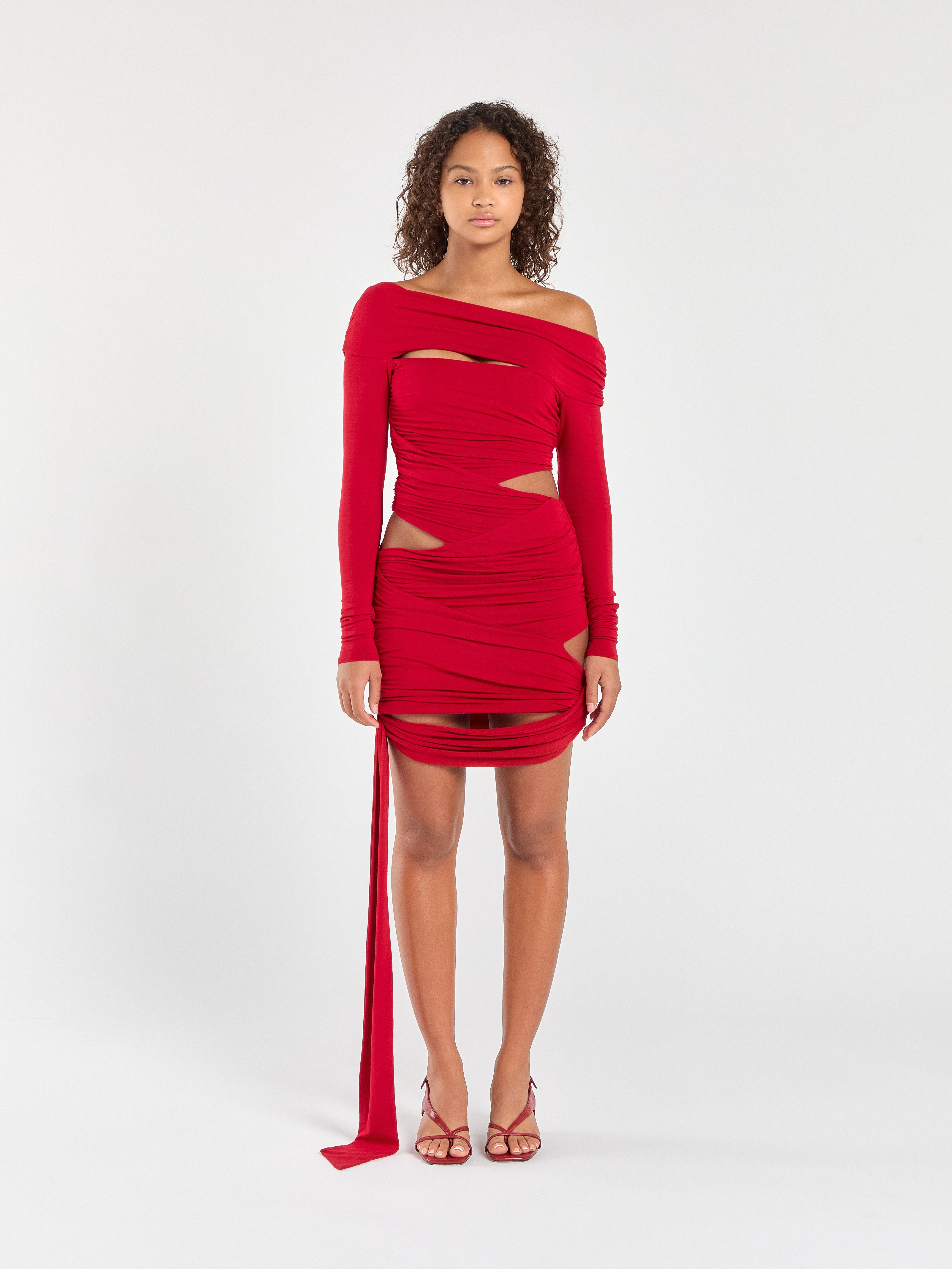 Make a bold statement with the Faux Wrap Mini Dress in Chili Red/Black. Perfect for cocktail parties, evening events, and date nights, this mini dress combines a sleek draped silhouette, asymmetrical hemline, and chic cut-out details for effortless elegance.