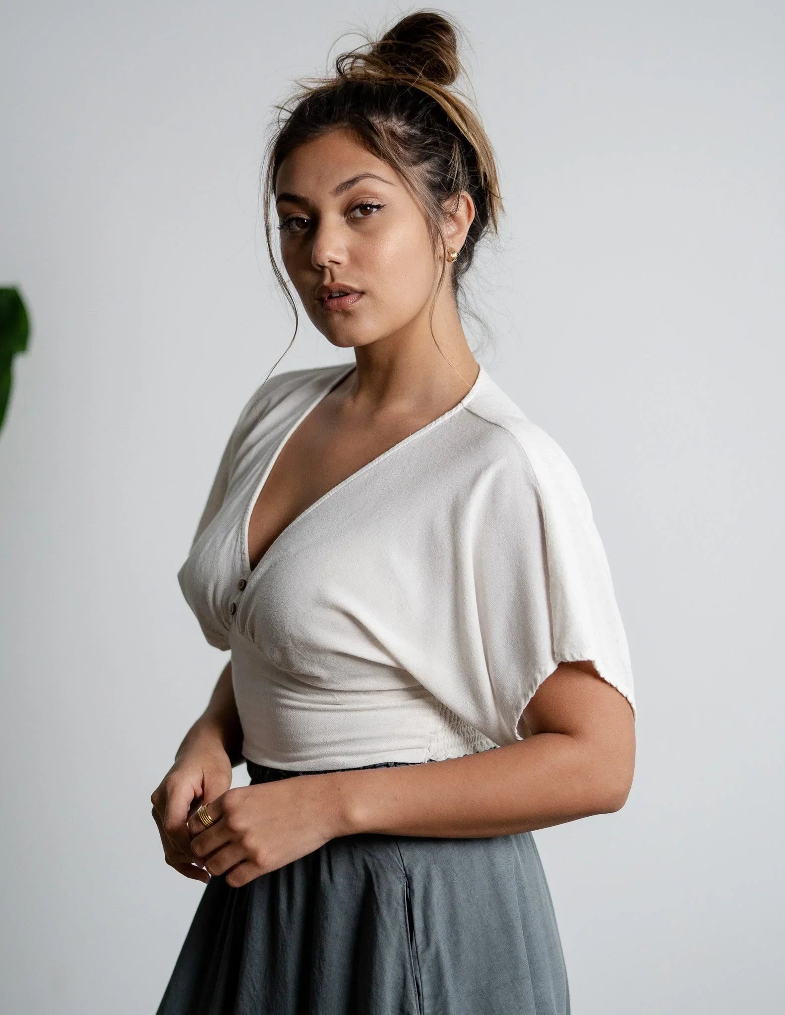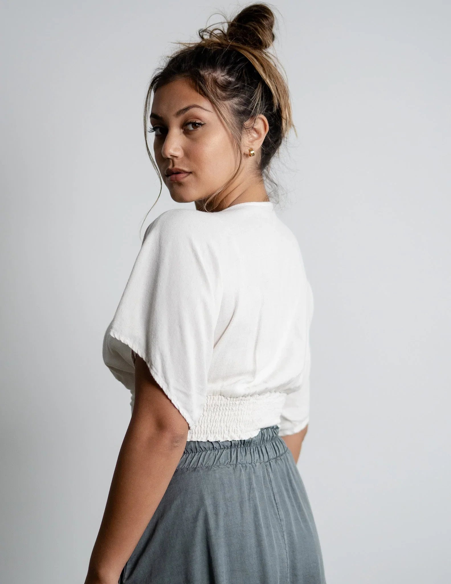 Pre-washed subtly soft linen blend v-neck top with two non-functioning button detail at the front, dolman sleeves, and smocking at the back.